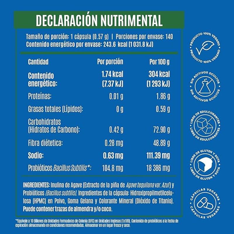 - Cápsula: Hidroxipropilmetilcelulosa (HPMC) en Polvo, Goma Gelana y Colorante Mineral (Dióxido de Titanio).